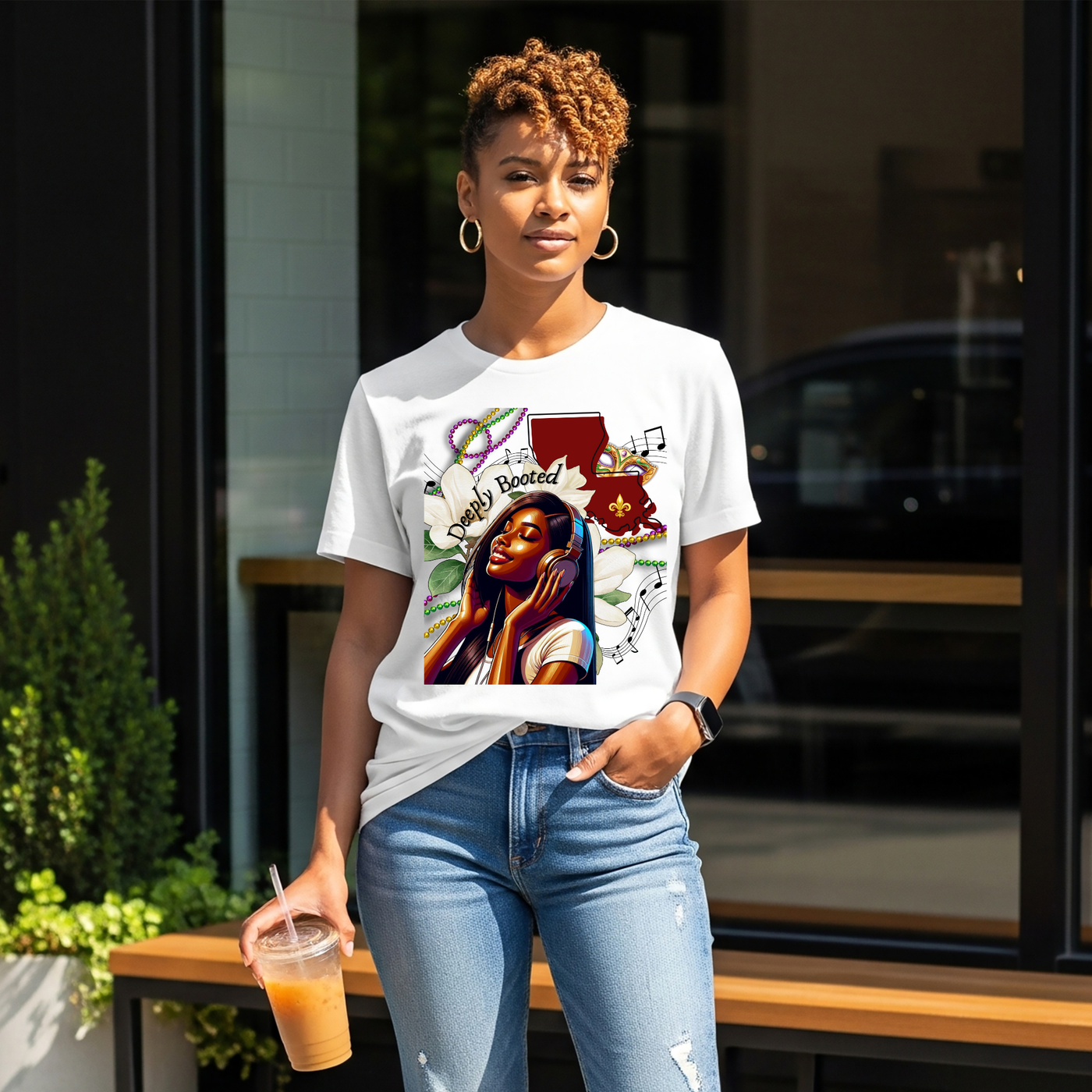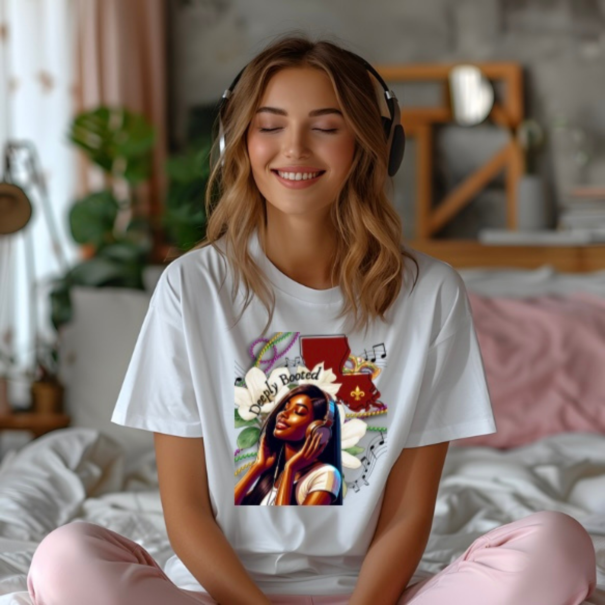 Stylish Graphic: The eye-catching graphic features the "Deeply Booted Podcast" text, music notes, fleur de lis, beads, magnolia flower, and Louisiana state outline adding a unique touch to your outfit.